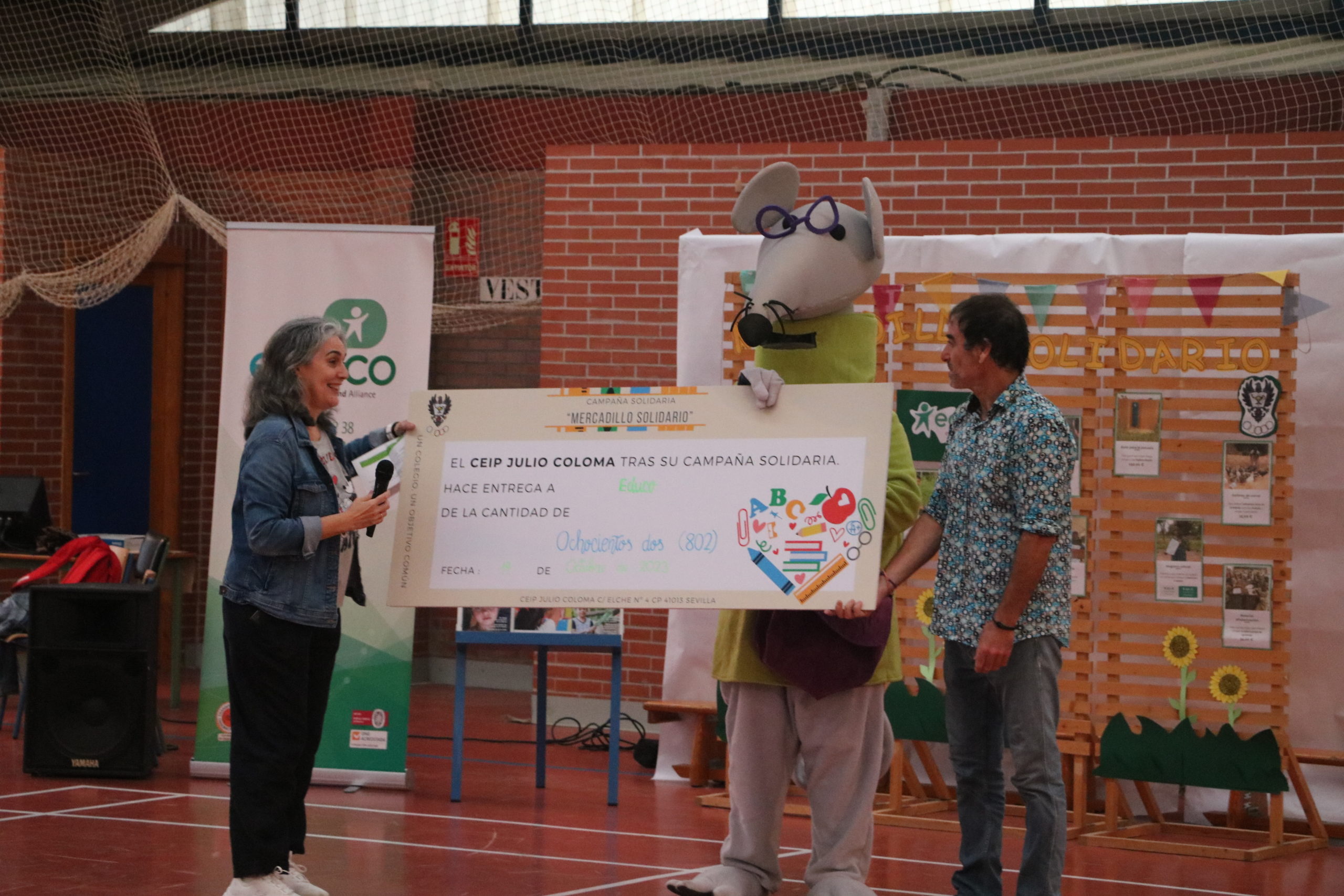 El CEIP Capitán General Julio Coloma Gallegos de Sevilla celebró el pasado 19 de octubre la entrega de la recaudación llevada a cabo en el MERCADILLO SOLIDARIO DE LIBROS a la organización Educo. Dicha entrega se llevó a cabo en el interior del gimnasio en las instalaciones del centro educativo dado que había previsión de lluvia. Esta iniciativa solidaria es un testimonio del compromiso de la comunidad educativa con el bienestar de los niños y niñas más necesitados.
